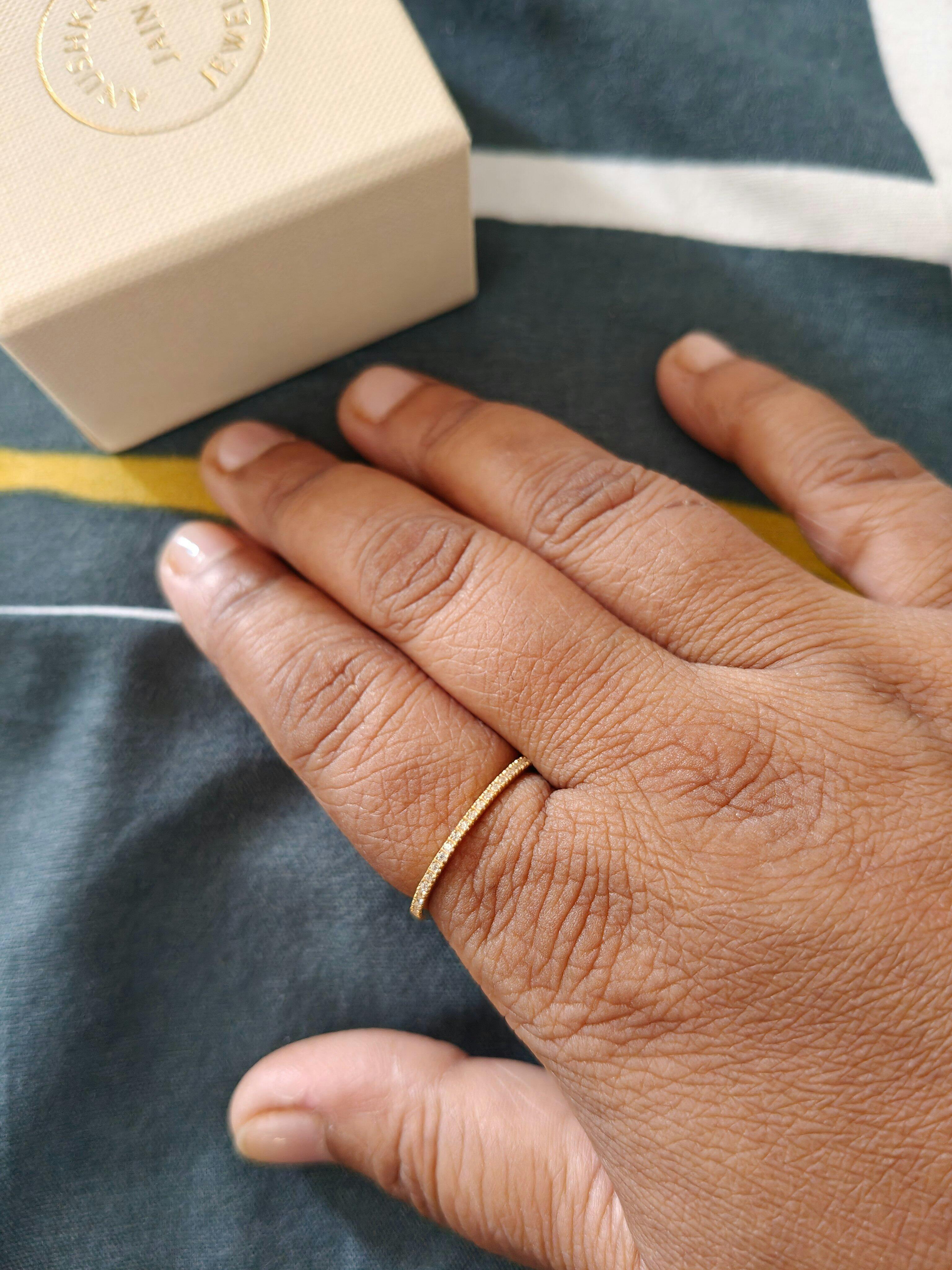 Stylish ring but thinner than I expected. It's a thin band with a coating of tiny solitaires. Truly minimal, works well as a mix and match or stackable ring. I got a bigger size so it's sad i wont be able to wear it often.